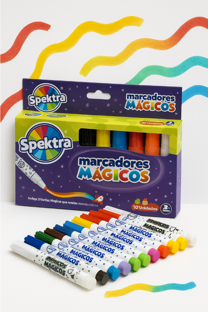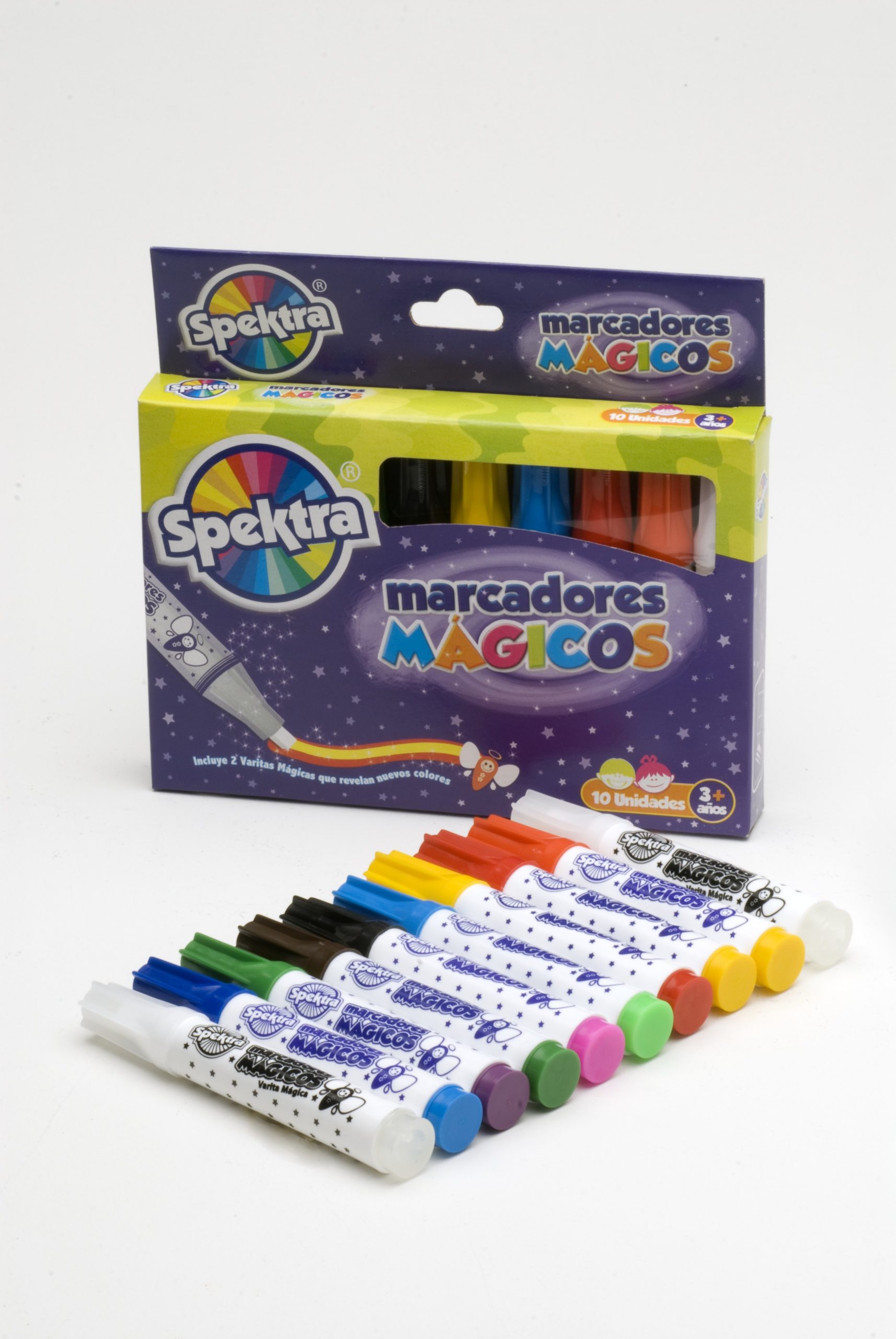 Nuestros Marcadores Mágicos cambian su color al aplicar la varita mágica. Escriben sobre materiales porosos como papel y cartón. La caja contiene ocho marcadores de diferentes colores y dos varitas mágicas. Punta tipo bala para trazos finos y suaves. Tinta lavable a base de agua.
