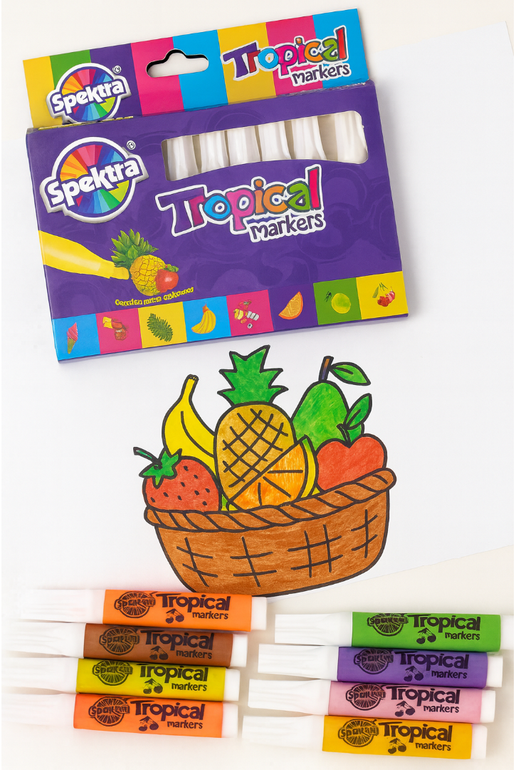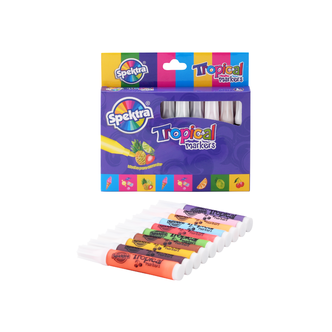 Nuestros Tropical Markers son ideales para aprender, dibujar y decorar. Cuando se aplican, los marcadores impregnan la superficie con su aroma. Escribe sobre materiales porosos como: papel,cartón y cartulina. No son tóxicos